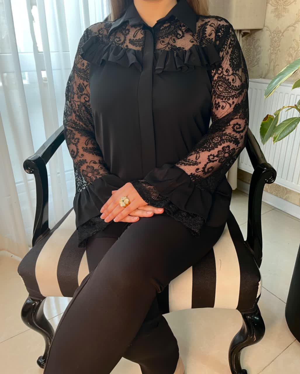 شومیز رکسانا (شایلی) 🛍----------------------------------قد شومیز 📏 حدوداً 70 جنس الیزه و تور🔺۴سایزی:۳۶-۴۴۴۶-۵۰۵۲-۵۶۵۸-۶۲🔴سایزبندی : (۲_۱ سانت خطا در نظر گرفته شود )سایز ۱ دورسینه ۱۰۶دور بازو ۴۰سایز ۲ دورسینه ۱۱۶دور بازو ۴۲سایز ۳ دورسینه۱۲۸دوربازو ۴۴سایز۴ دورسینه۱۴۴-۱۴۵دوربازو۴۶ ✔️اگر خارج از سایزبندی ما هستید با افزایش هزینه به سایز دلخواه شما کار دوخته میشه.