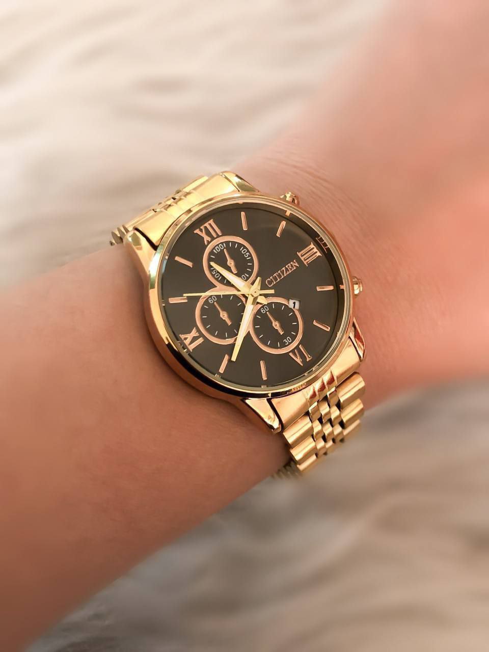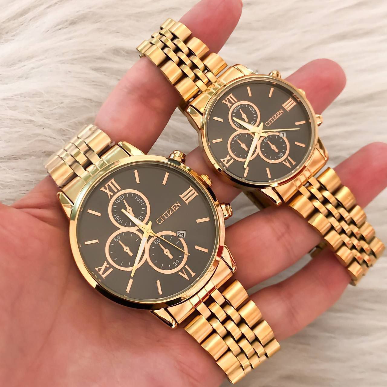 شناسه: #369078ست ساعت زنانه و مردانه مارک سیتیزن بنداستیل طلایی صفحه مشکی. ✨طرح سه موتوره✨دارای تقویم. کیفیت عالی. ✨شش ماه گارانتی موتور✨ارسال با جعبه کادویی و کارت ضمانت✨قطر شیشه ساعت مردانه 38 میلیمتر✨قطر شیشه ساعت زنانه 28 میلیمتر